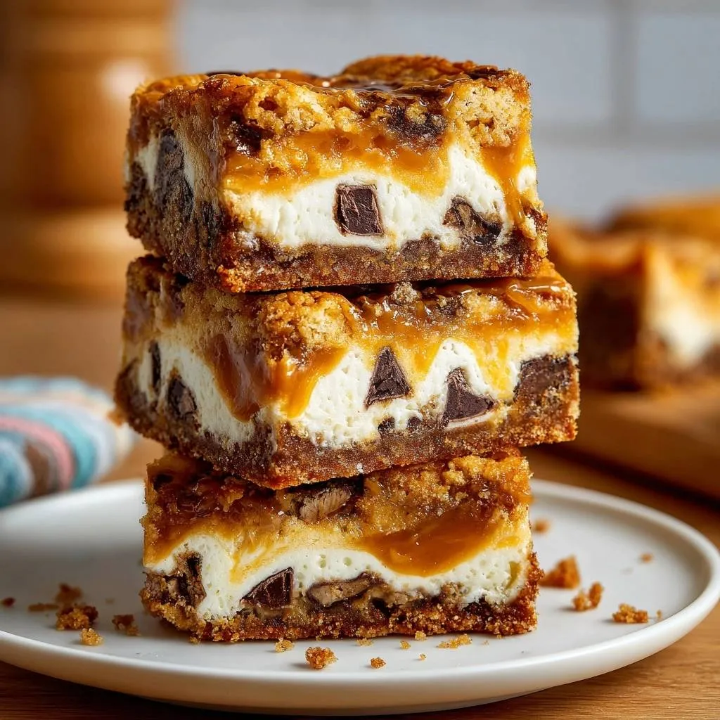 Crisp graham cracker crust cheesecake bars with creamy chocolate filling, swirled caramel, and crunchy topping—no soggy bottom guaranteed!