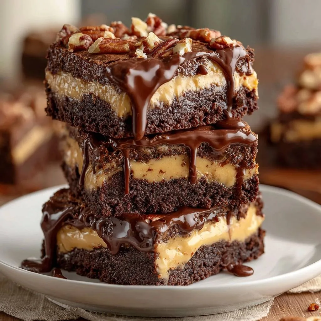 Foolproof stovetop caramel brownie bars with thick, sliceable caramel layer that never oozes, fudgy brownie base, ganache topping, and toasted pecans.
