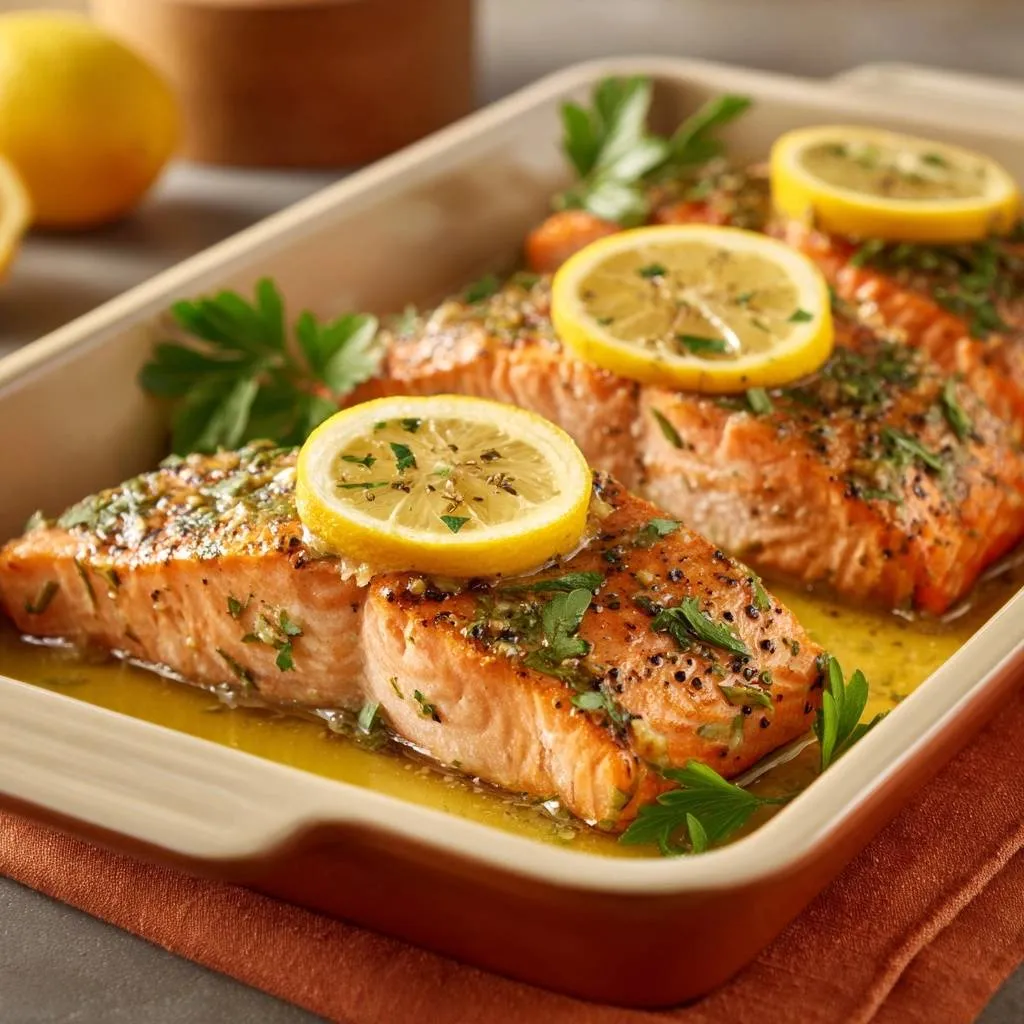 Moist, flaky baked salmon with olive oil bath and lemon steam technique for juicy fillets every time.