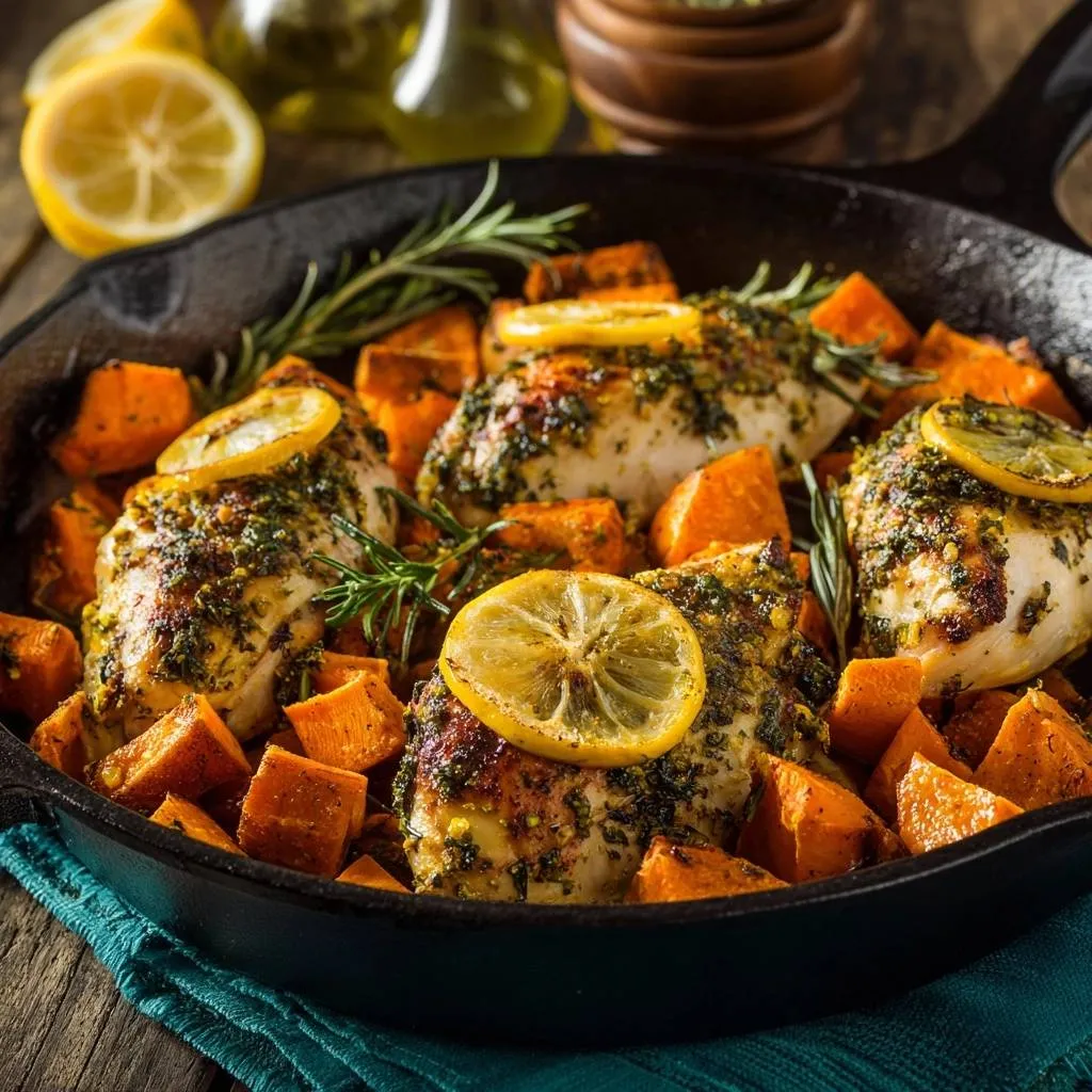 Crispy herb-crusted chicken thighs seared in a cast iron skillet and oven-finished with sweet potatoes, lemon, and rosemary for juicy, never-dry results.