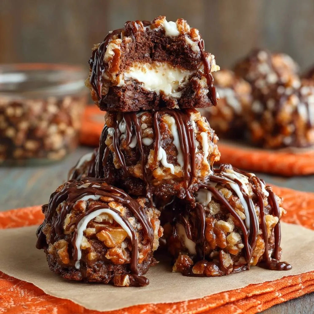 Fudgy brownie bites stuffed with creamy cheesecake, coated in crunchy pecans and chocolate drizzle. No crumbling with our cream cheese binding trick!