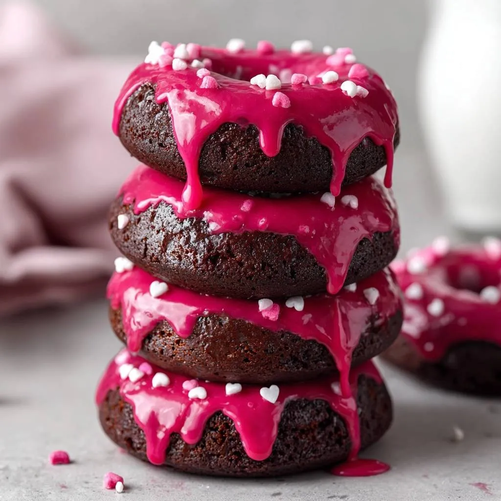 Moist chocolate baked donuts with pink glaze. No more dry donuts! Oil and yogurt keep them tender.