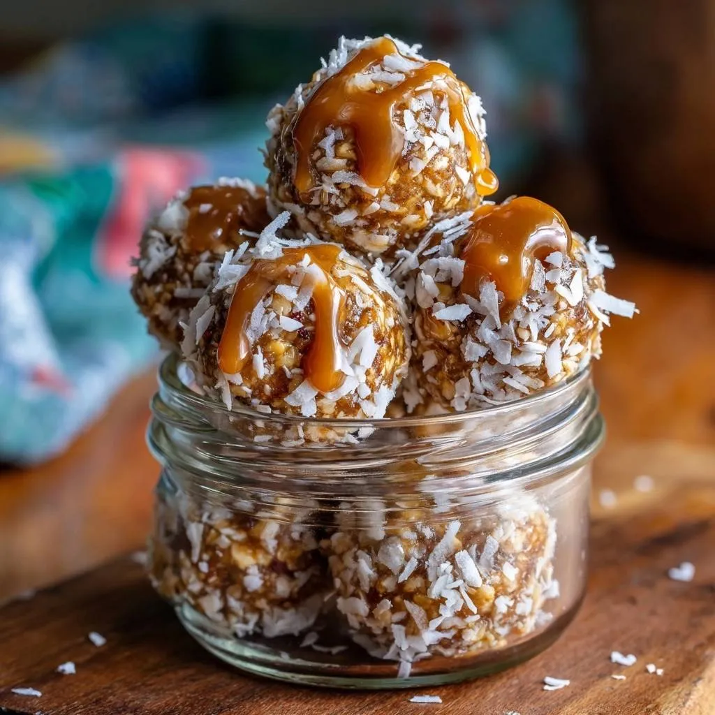 Foolproof no-bake energy balls with coconut, peanuts, and dates that hold perfect shape using a food processor method. Drizzled with homemade caramel for a delicious grab-and-go treat.