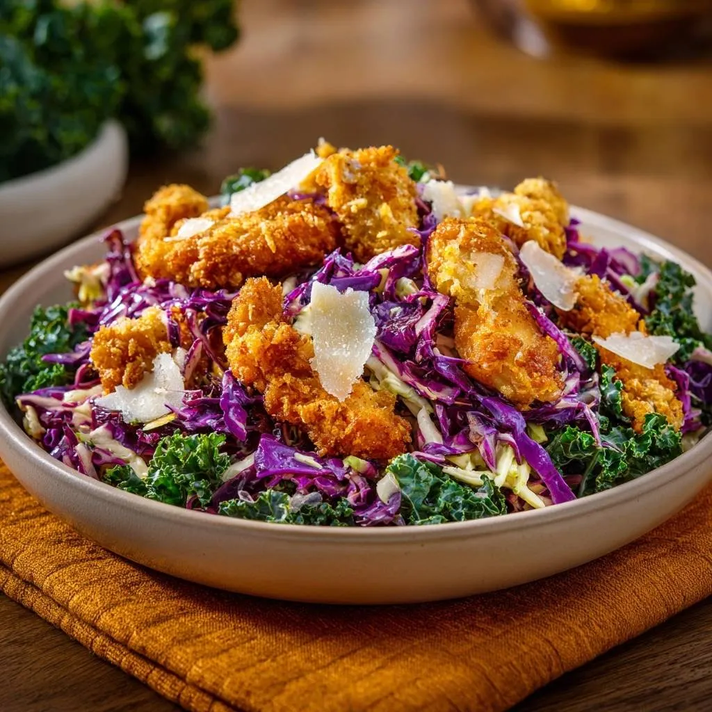 Crispy fried chicken over tenderized kale and purple cabbage slaw, using a double-drain fry method to keep every bite crunchy and fresh.