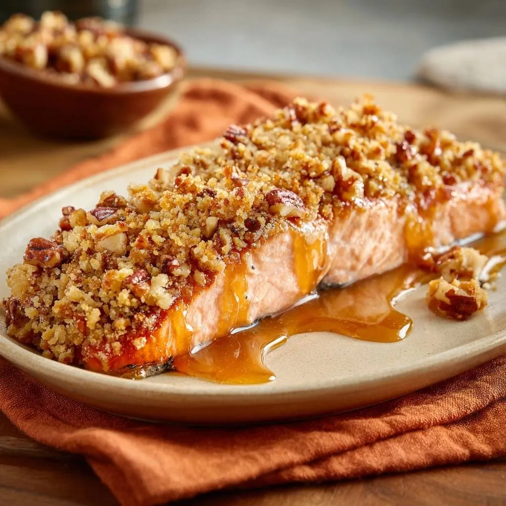Crispy pecan crusted honey salmon with a shatter-crisp nut topping over juicy fillets. Pat dry, press tight, broil for perfection—no sogginess!