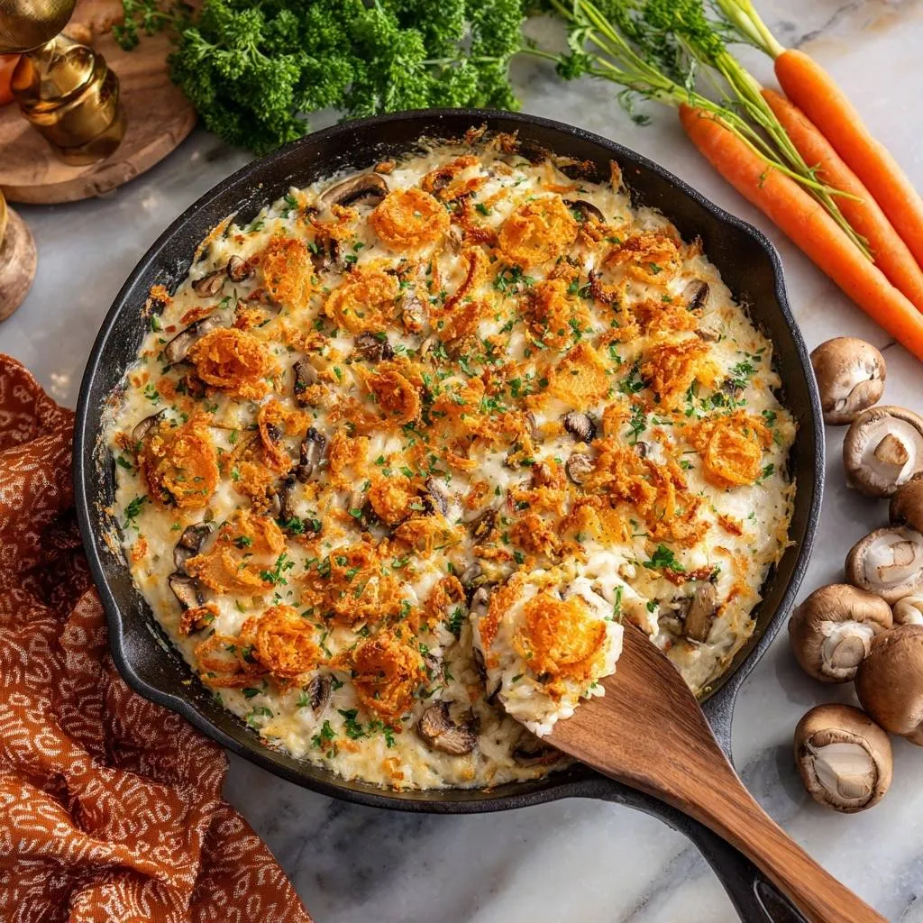 Creamy cheesy rice loaded with mushrooms, topped with shatteringly crisp fried onions. Foolproof weeknight skillet bake with broil trick for perfect crunch.