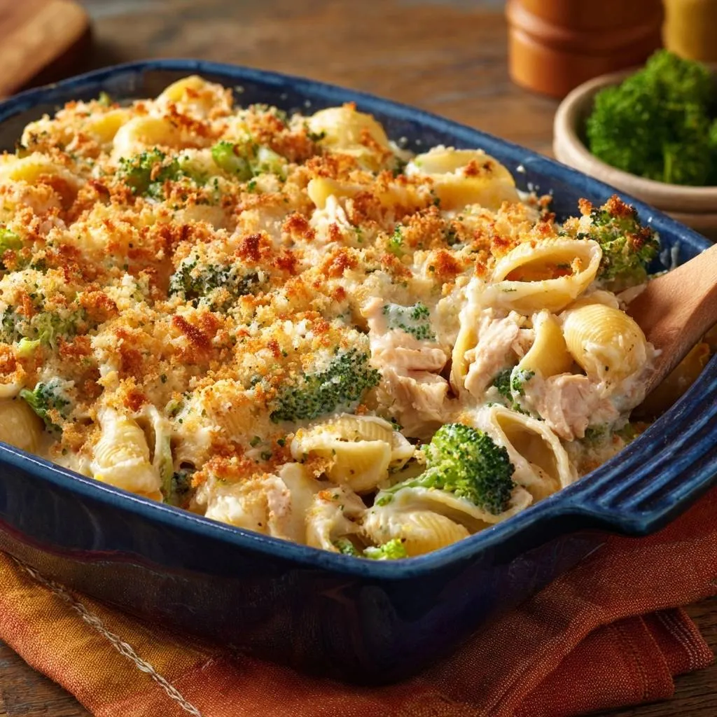 Creamy pasta bake with chicken, broccoli, and cheddar cheese topped with a shatteringly crisp panko breadcrumb crust. No soggy toppings here!