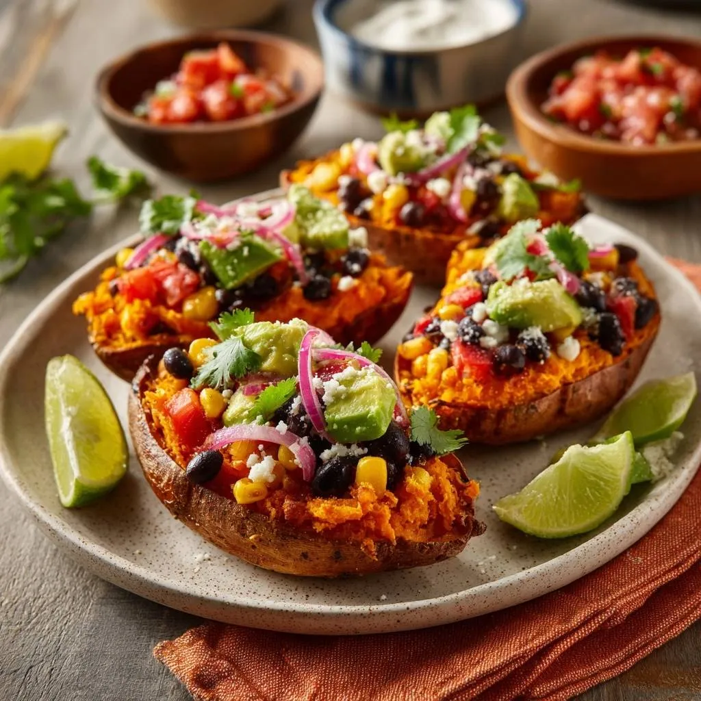 Perfectly fluffy, moist baked sweet potatoes topped with black beans, corn, avocado, cotija cheese, and fresh Mexican flavors for a healthy, delicious meal.