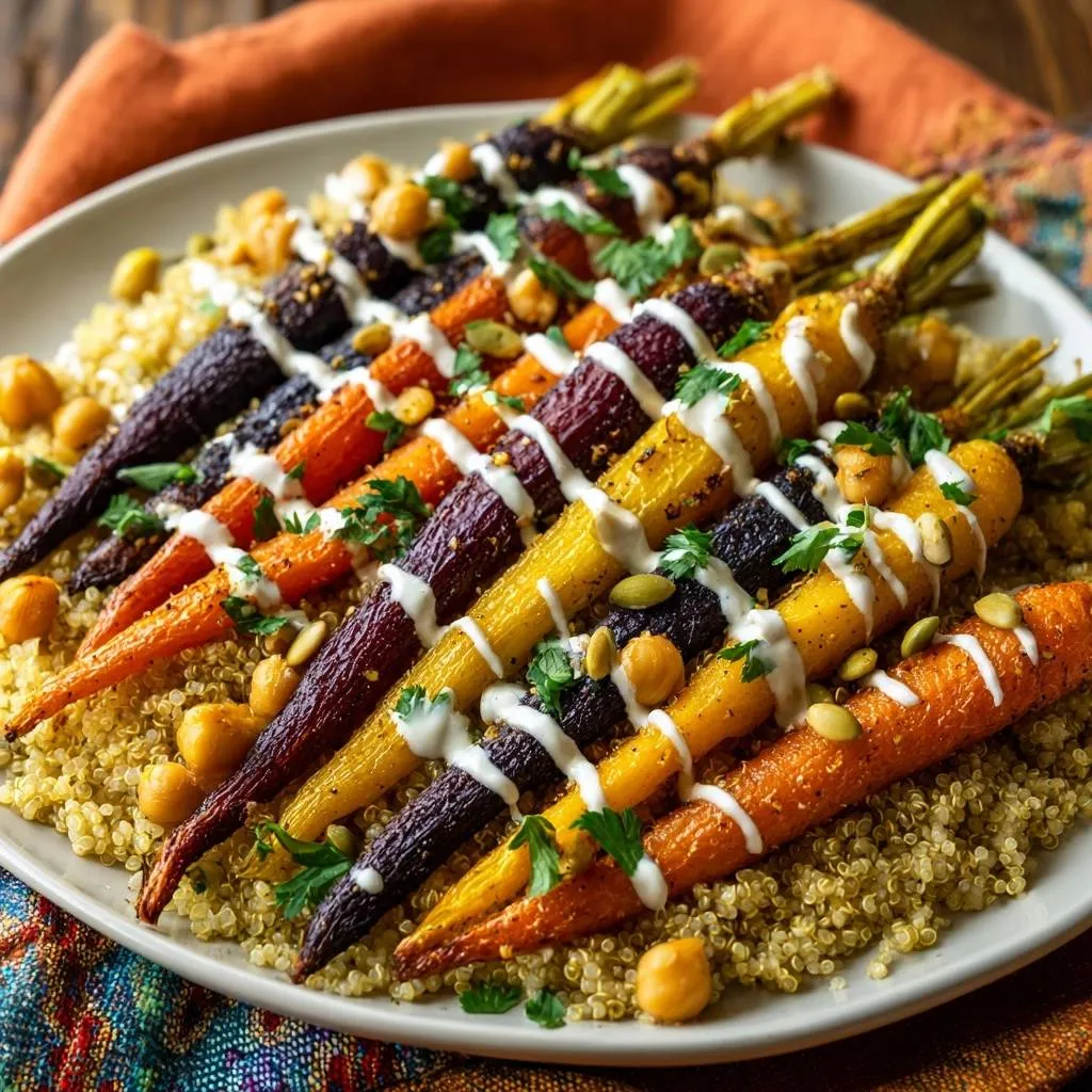 Vibrant roasted rainbow carrots with chickpea quinoa, featuring a parboil trick for juicy, caramelized perfection. Easy, healthy, and packed with texture.
