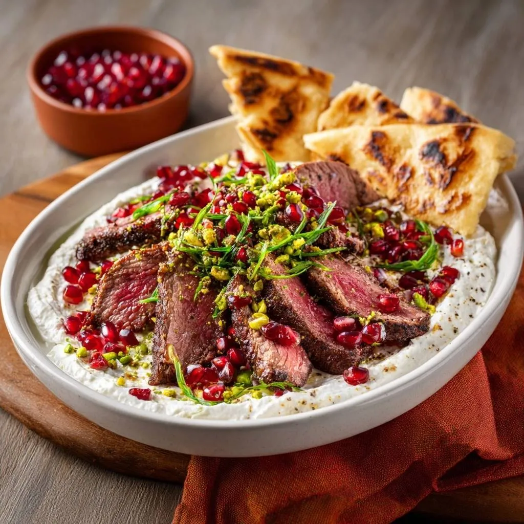 Juicy seared flank steak with creamy labneh, tart pomegranate seeds, crunchy pistachios, and fresh dill, served with charred naan. Foolproof high-heat technique for perfect crust and pink center every time.