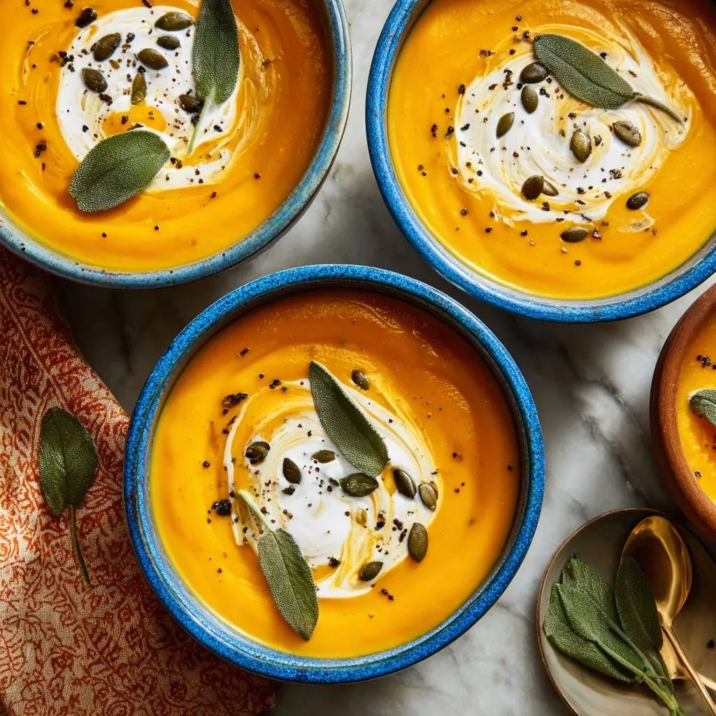 Thick, creamy roasted butternut squash soup made by roasting squash first to caramelize sugars and eliminate watery texture. Garnished with pepitas and sage.