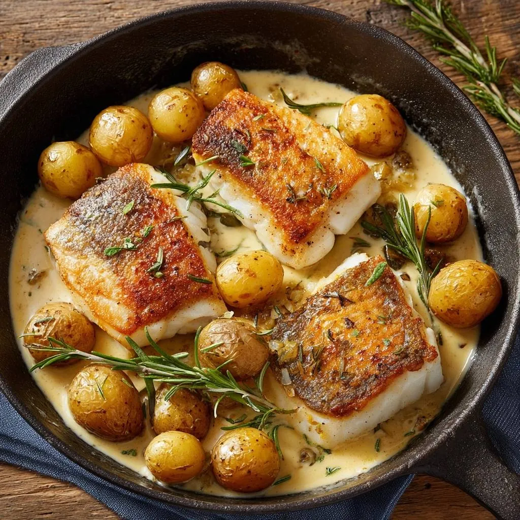Flaky, moist cod with crispy edges, baby potatoes, and rosemary cream sauce. Hot-sear-first method locks in juices for perfect fish every time.