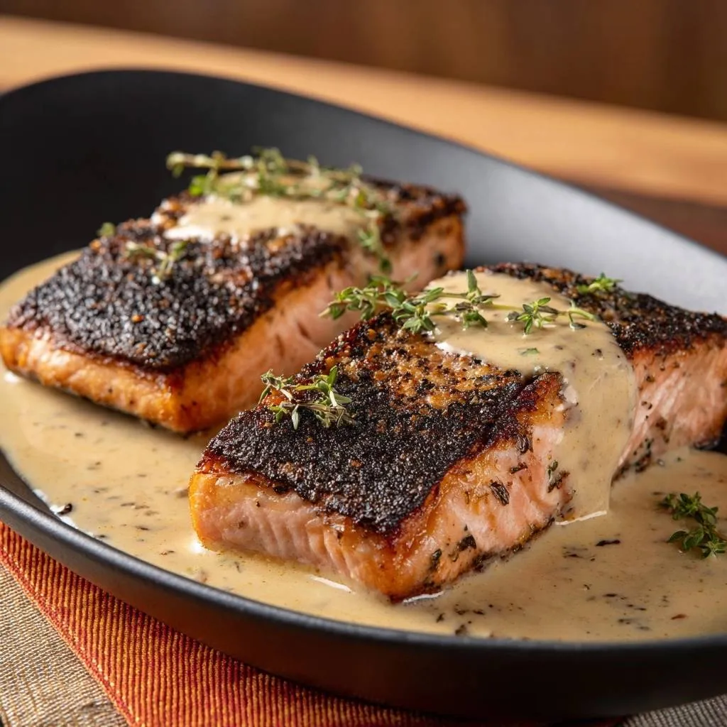 Perfectly blackened salmon with a charred crust and creamy thyme sauce for moist, flaky results every time.