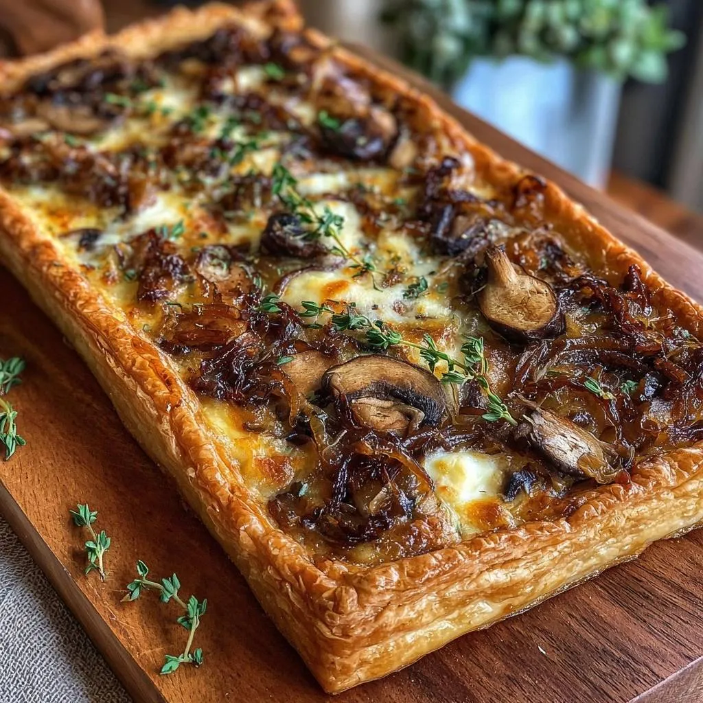 Foolproof caramelized onion and mushroom tart with Gruyere cheese on a crispy puff pastry crust. Blind-baked and double-dried filling ensures no soggy bottom every time.