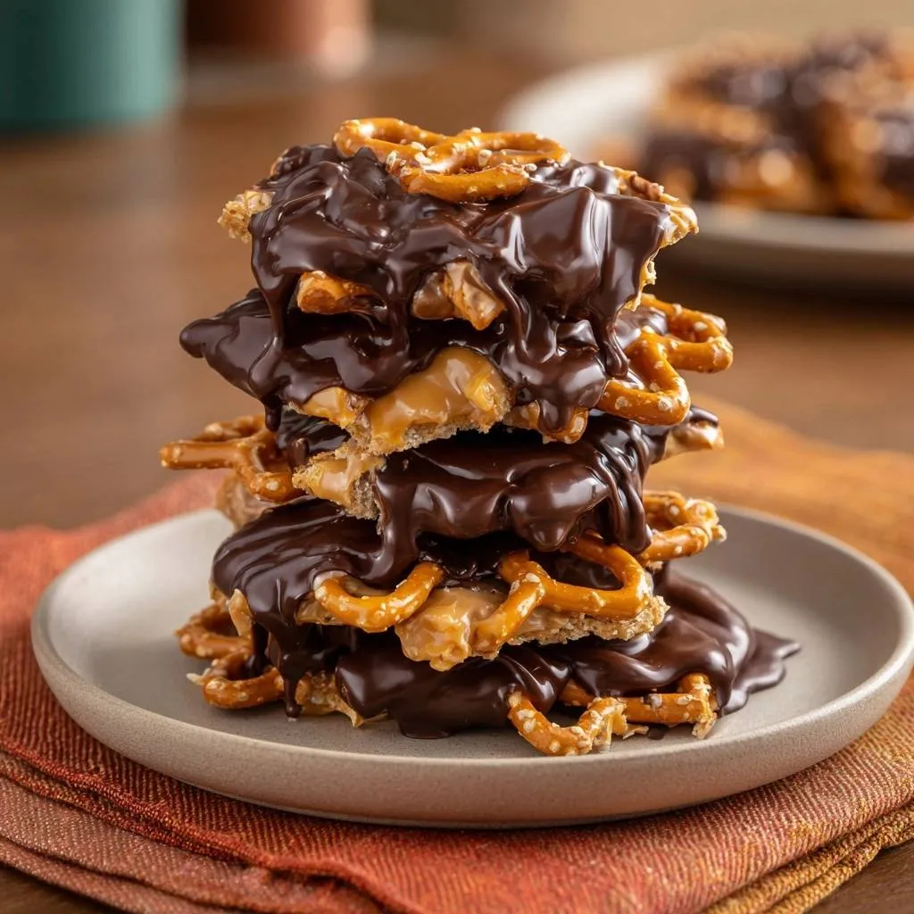 Crunchy chocolate-coated pretzel clusters topped with caramel, using a seal-first technique to prevent sogginess. Perfect sweet-salty treat!