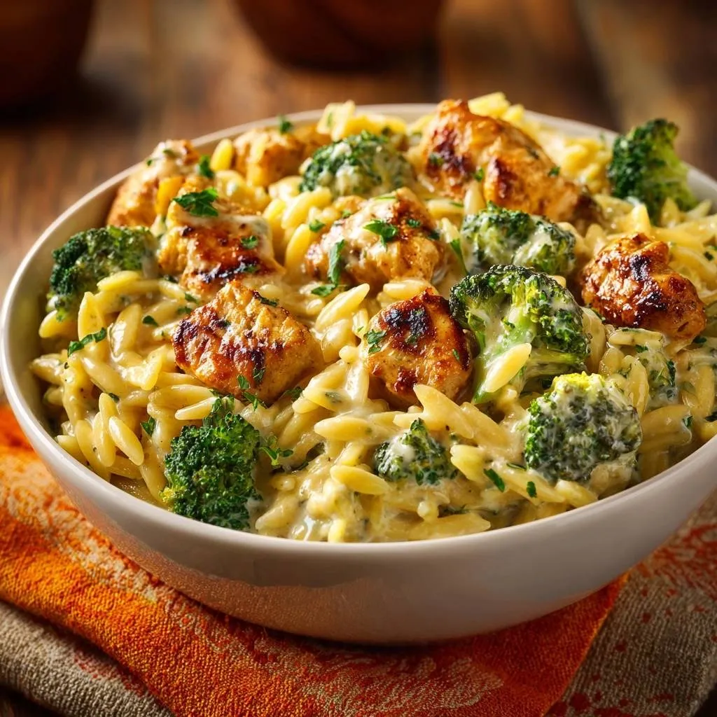 Foolproof creamy chicken broccoli orzo with juicy chicken seared to perfection. Tender bites in a cheesy sauce with broccoli and orzo.