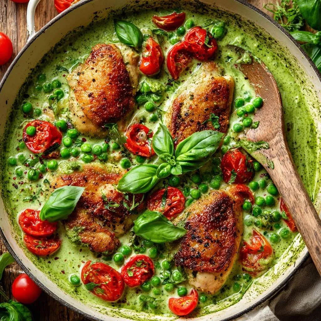 Crispy skin-on chicken thighs nestled in vibrant pesto sauce with peas and sun-dried tomatoes. One-pan recipe that keeps the skin ultra-crunchy while the meat stays juicy.