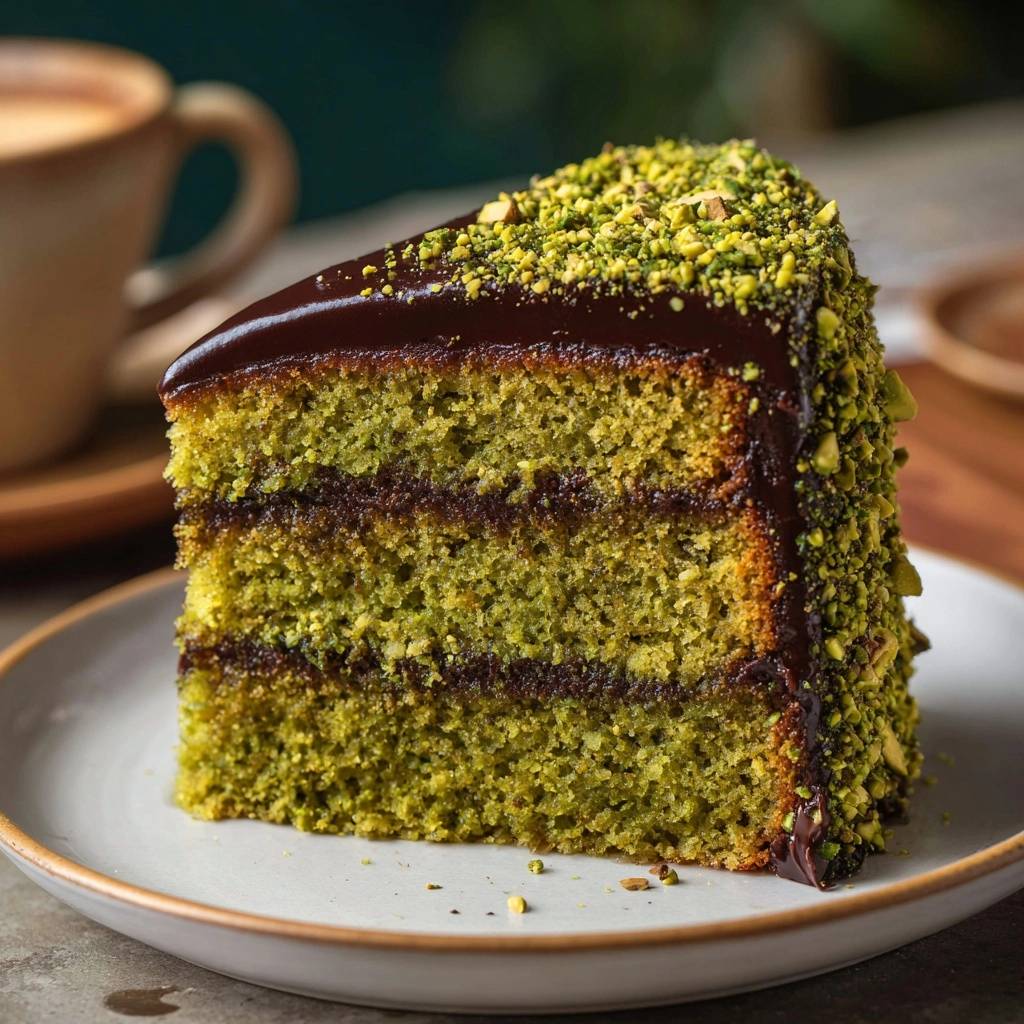 A foolproof pistachio layer cake using the reverse-creaming method to prevent sinking, topped with a rich dark chocolate ganache and crushed pistachios.