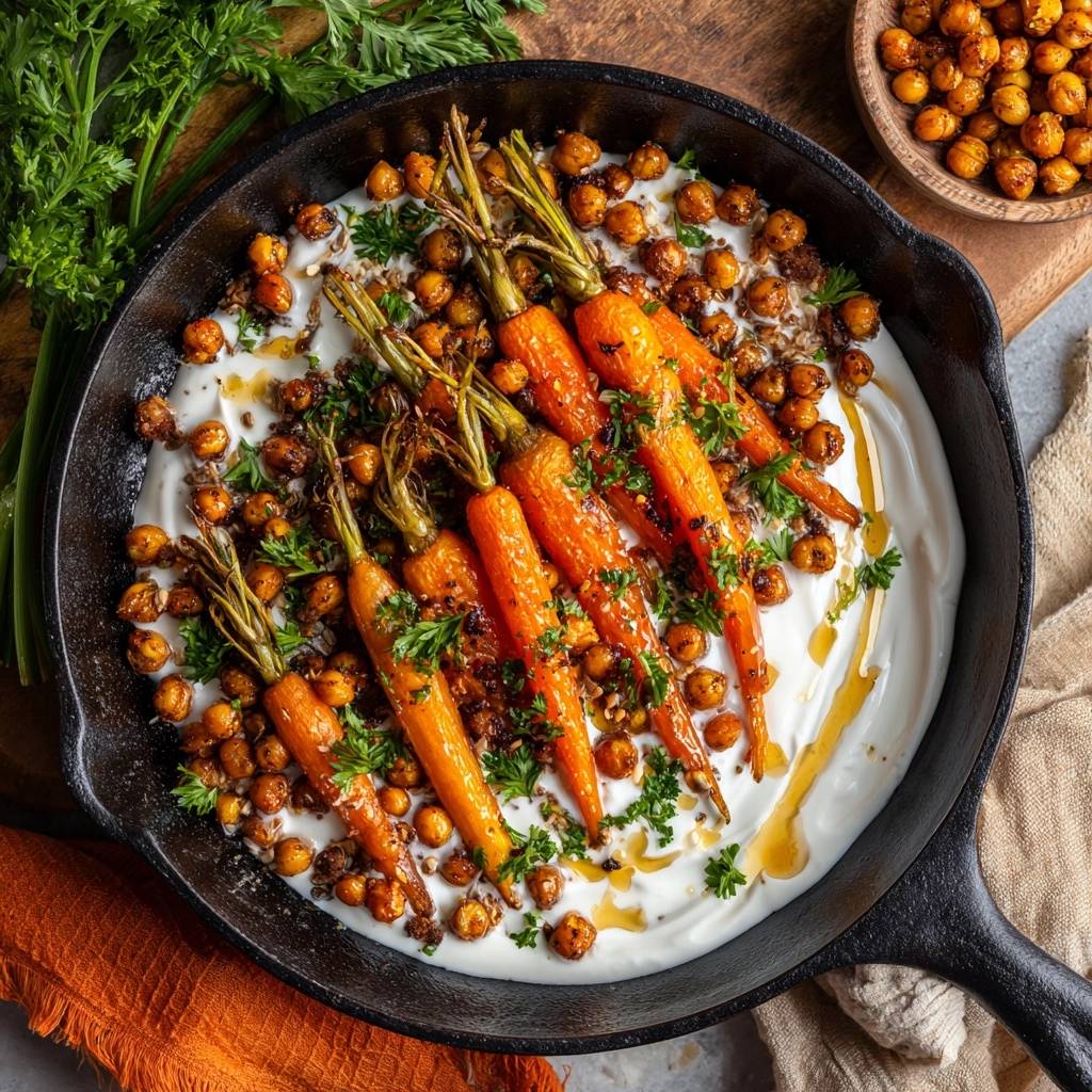 Learn the secret to restaurant-quality roasted carrots and chickpeas with a preheated skillet and whipped yogurt base for the perfect texture contrast.