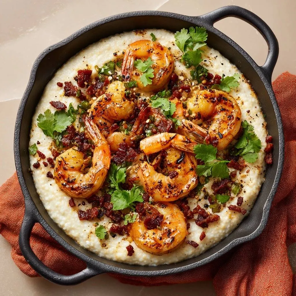 - Spoon creamy grits into skillet. Top with shrimp, bacon, and cilantro. Serve hot.