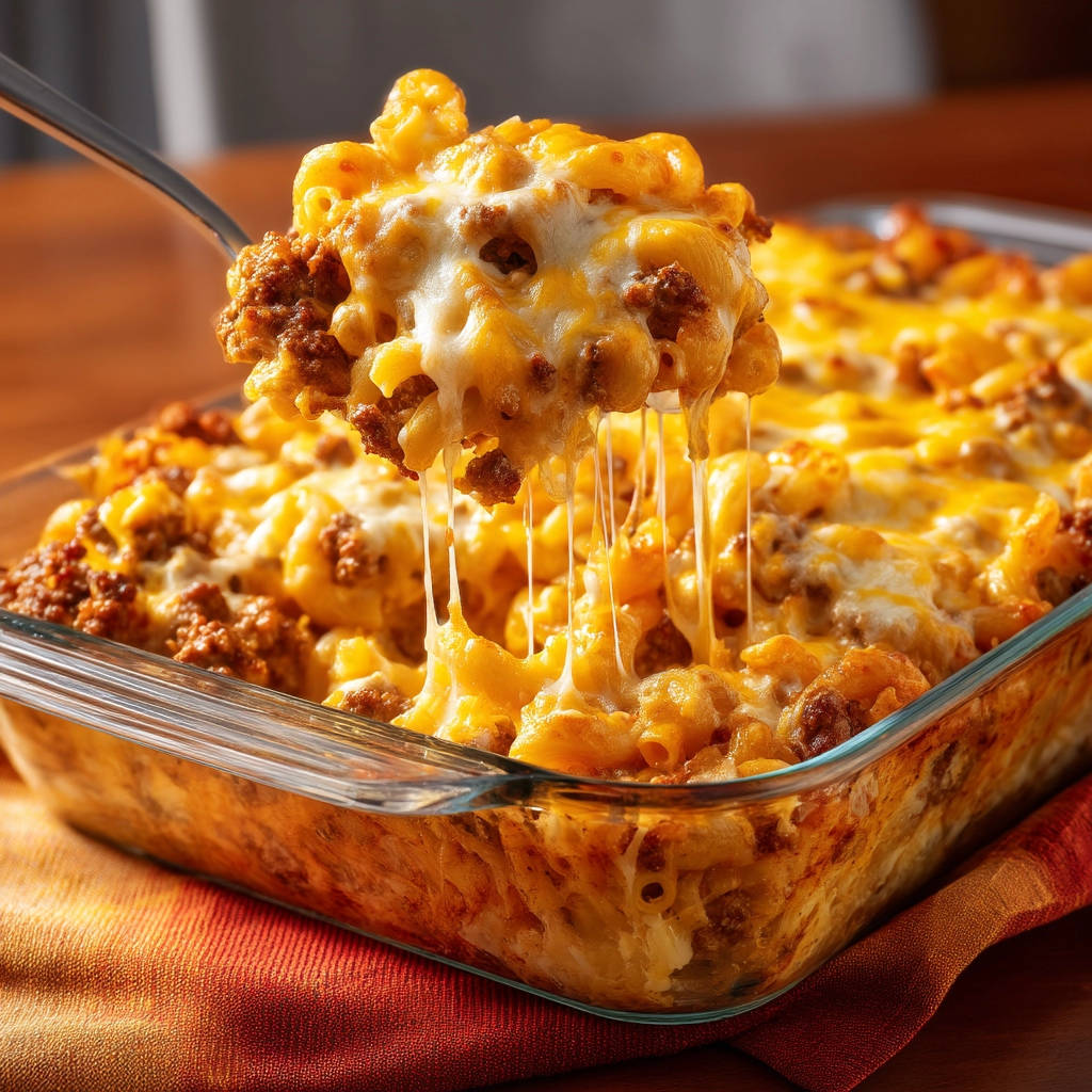 - Assemble the Casserole: Grease a 9×13 inch baking dish. Pour the beef mac and cheese mixture into the prepared dish, spreading it out evenly.