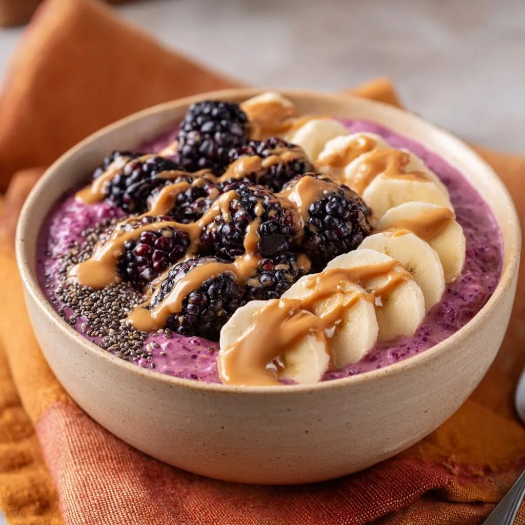 One bowl packs about 450 calories, 15g protein from PB and chia, 10g fiber for steady energy, and antioxidants from blackberries. Banana adds potassium; it’s a balanced powerhouse for sustained fullness in Blackberry Peanut Butter Oat Bowl form.