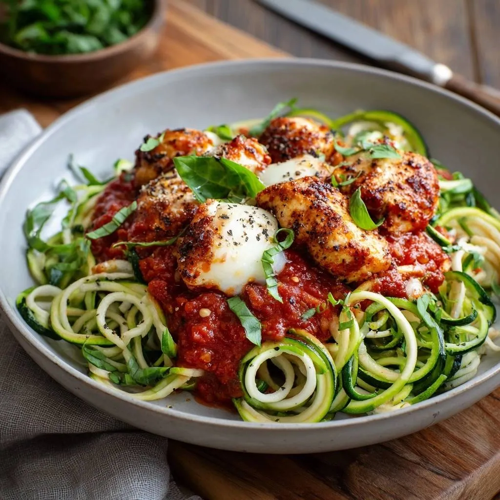 Yes, use jarred low-sugar marinara if homemade’s unavailable; warm it first for even coating. For dairy-free, swap Parmesan with nutritional yeast. No zucchini? Try cabbage noodles, salted same way. Chicken alts like shrimp sear faster, 2 minutes per side.