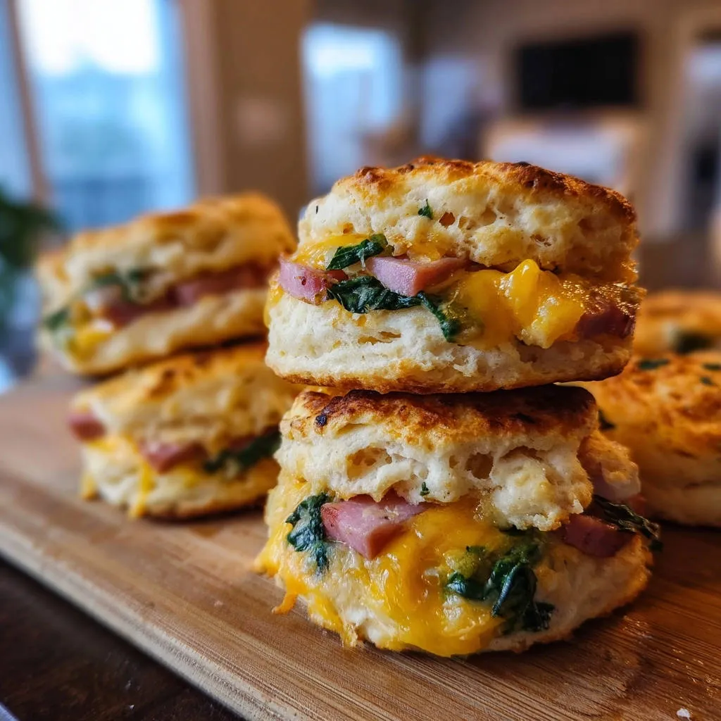 - Slice the warm biscuits horizontally. Layer the bottom half with ham, spinach, the egg and cheese mixture, and crumbled bacon if using. Top with the other biscuit half. Serve immediately.