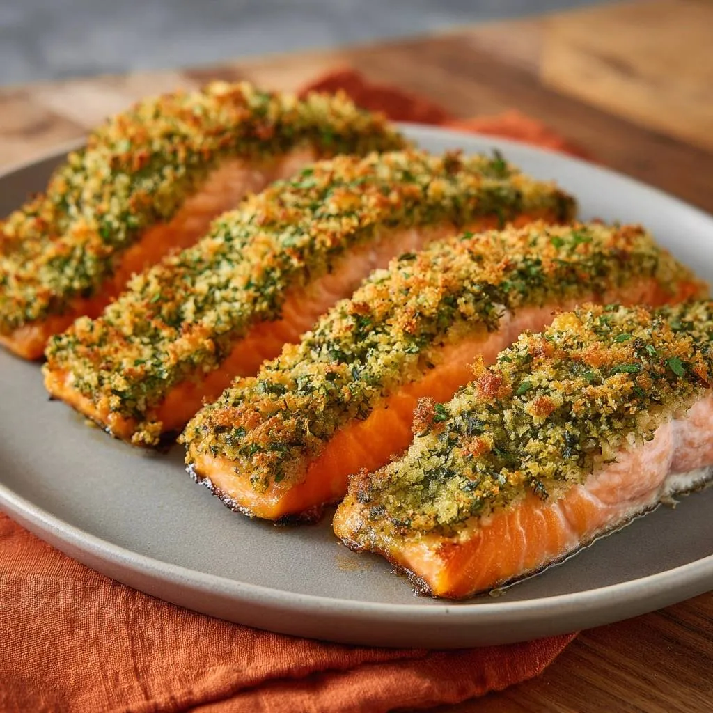Panko soaks up excess moisture, staying crisp thanks to its flaky structure. Meanwhile, the crust’s edges hit Maillard reaction for nutty flavor. Therefore, you end up with juicy salmon and a golden top.