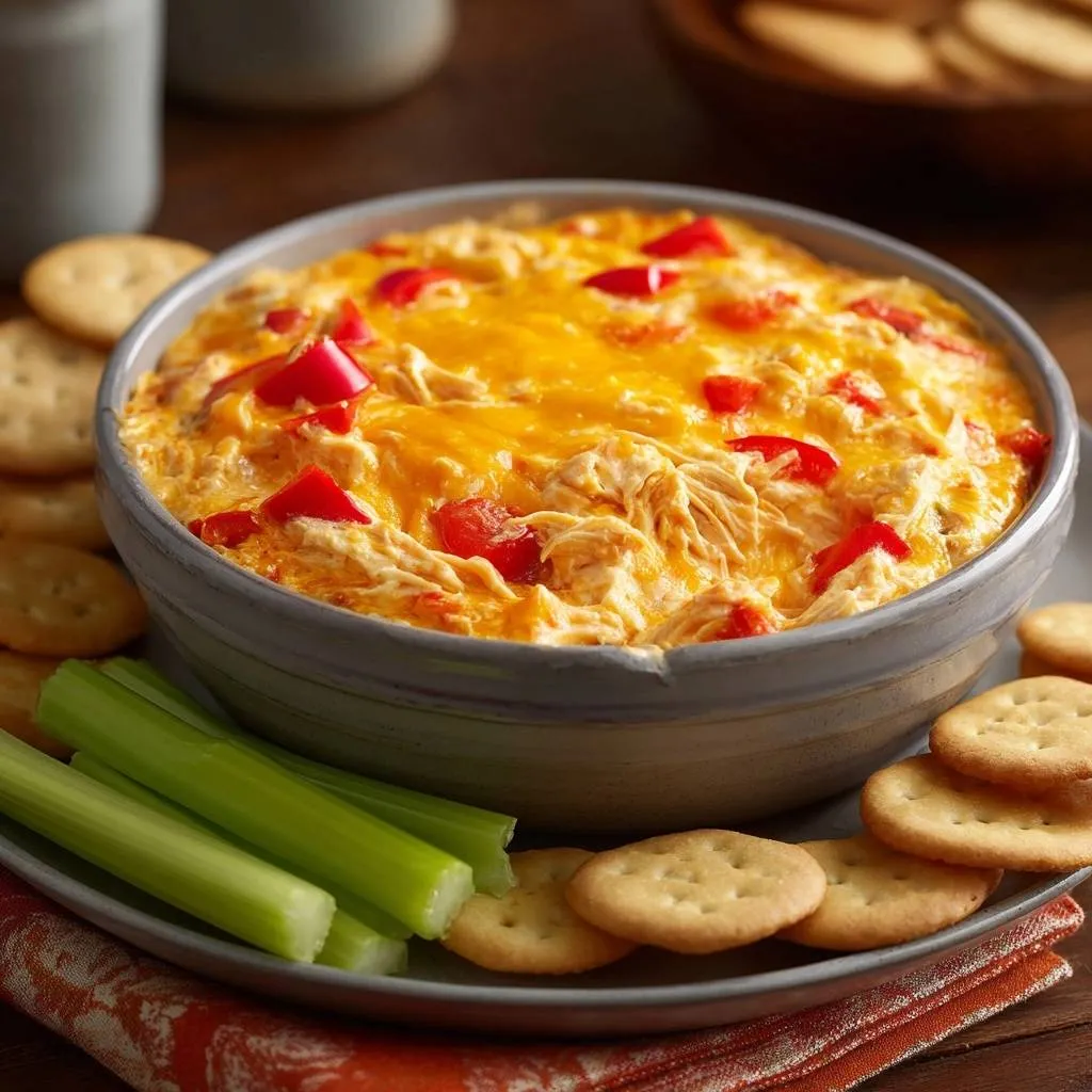 Here’s what you need: 2 cups shredded cooked chicken, 1 cup diced red bell peppers, 8 oz softened cream cheese, 1/2 cup buffalo wing sauce, 1 cup shredded cheddar cheese (divided), 1/2 cup sour cream, salt and pepper to taste. Celery sticks and crackers for serving.