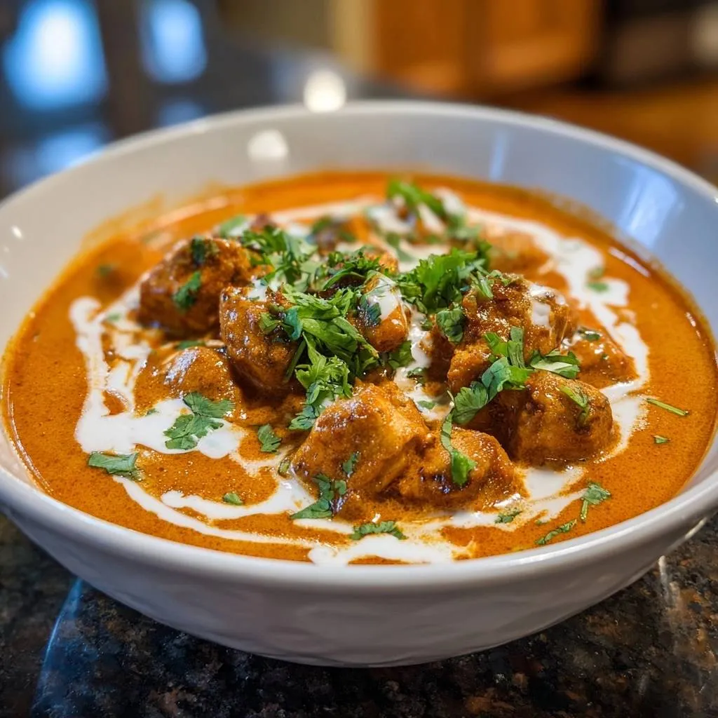 Fresh cilantro adds bright, herbaceous contrast to rich butter chicken. A cream swirl boosts visuals and cools the palate. Finely chop onions first for a smooth base.