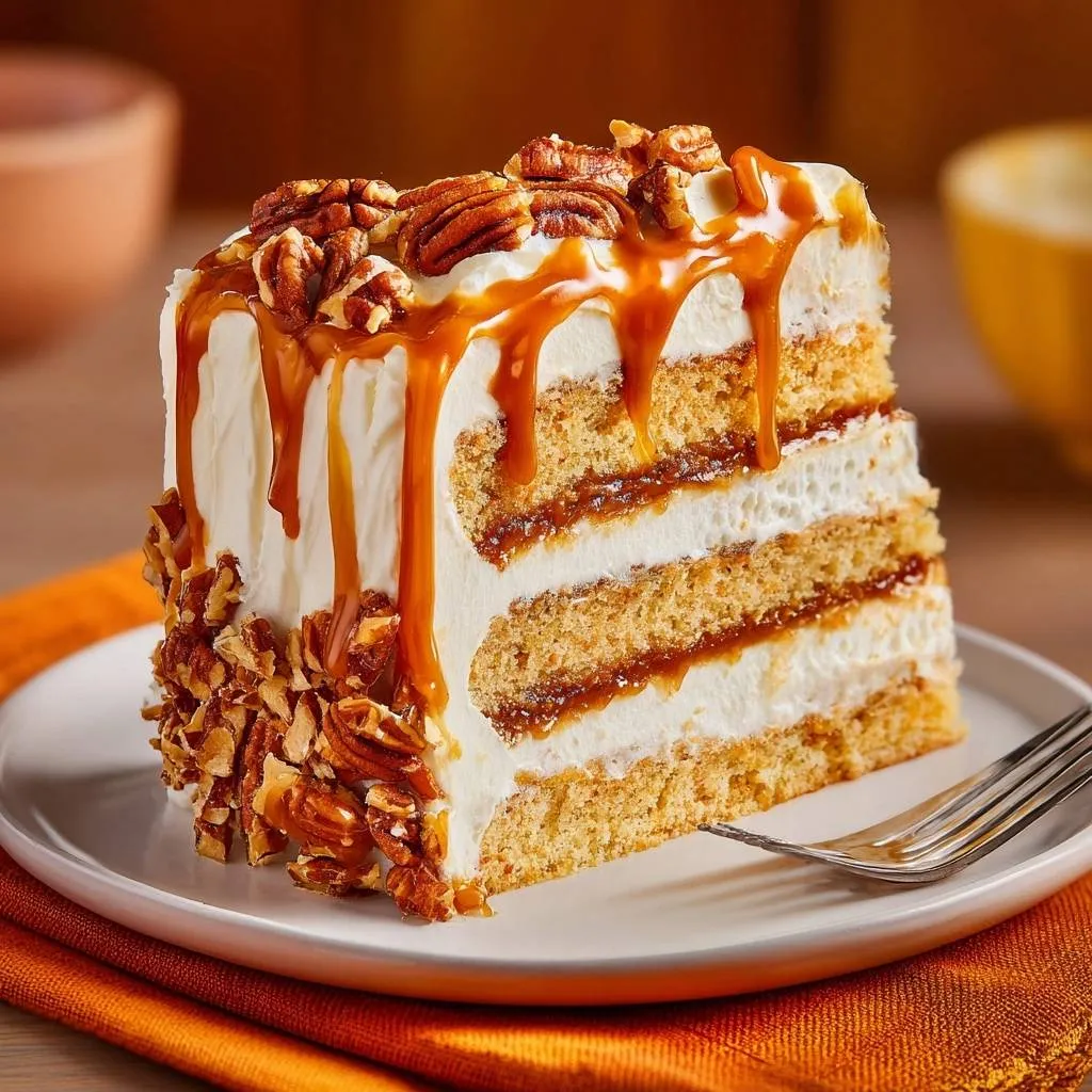 - Finish: Toast pecans in 350 F oven 5-7 minutes until fragrant. Drizzle cake with caramel sauce. Press pecans into top and sides. Chill until serving. Slice for perfect, non-soggy layers!
