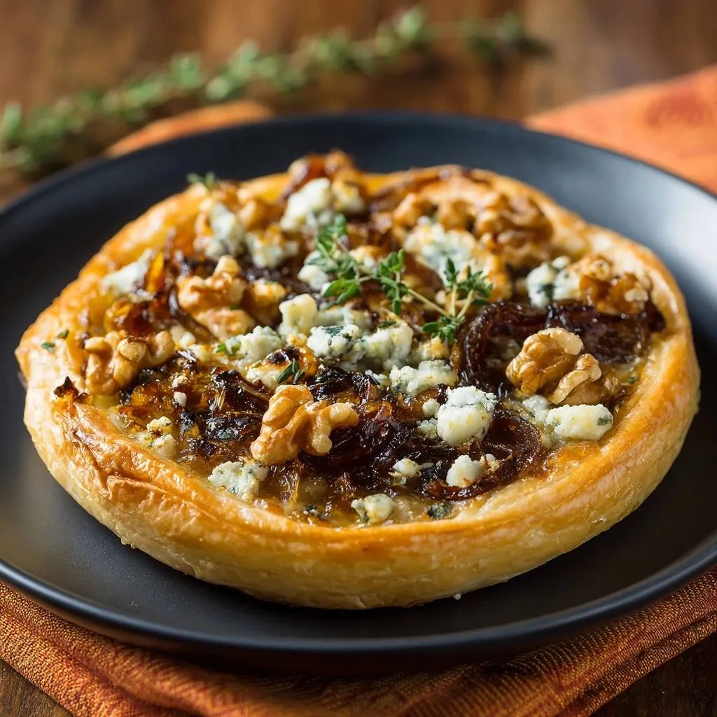 - Spread cooled onions evenly over pastry, leaving a 1-inch border. Top with crumbled blue cheese, chopped walnuts, and thyme leaves. Fold edges slightly inward for a rustic look.