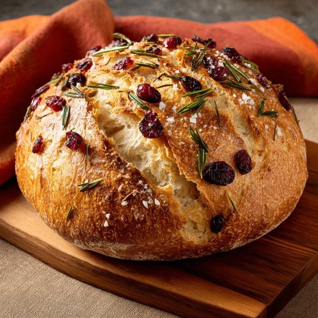 No-knead artisan bread with dried cranberries and rosemary, baked in a Dutch oven for a shatteringly crispy bakery-style crust every time.