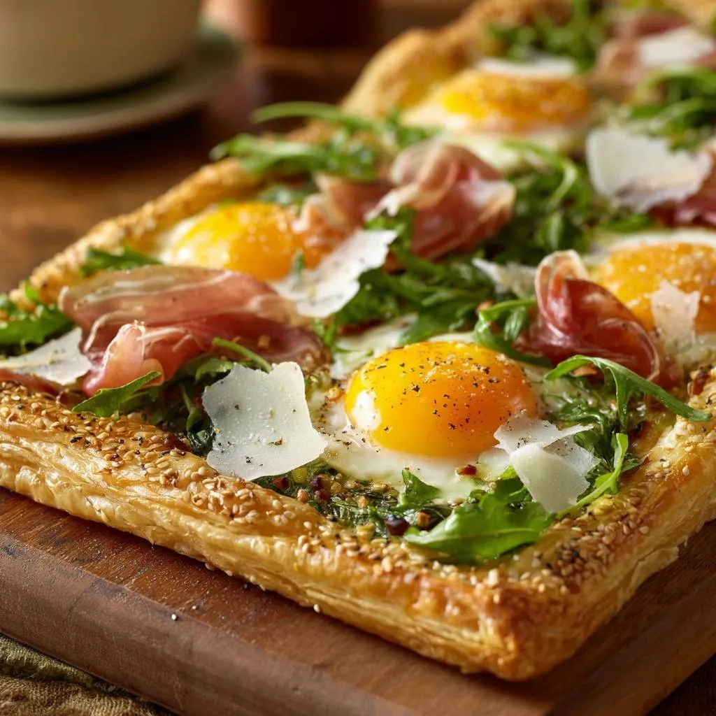 A foolproof recipe for a crispy breakfast puff pastry tart featuring pesto, eggs, and prosciutto, using a par-baking technique to prevent a soggy bottom.
