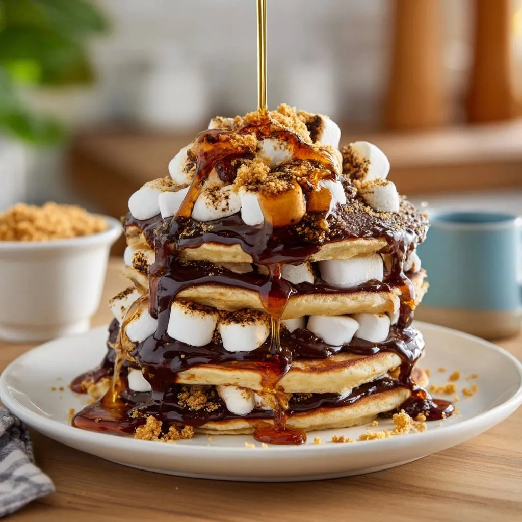 Fluffy s’mores pancakes with melty marshmallows, chocolate sauce, and graham crackers that stay tall and dreamy thanks to a foolproof egg white whipping trick.