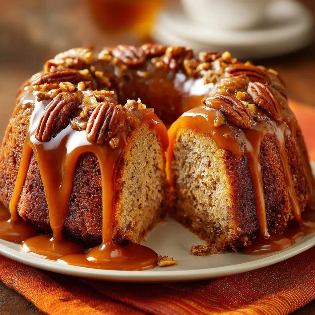 A stunning, perfectly released caramel pecan bundt cake with a rich topping and crunchy pecans. Foolproof method!