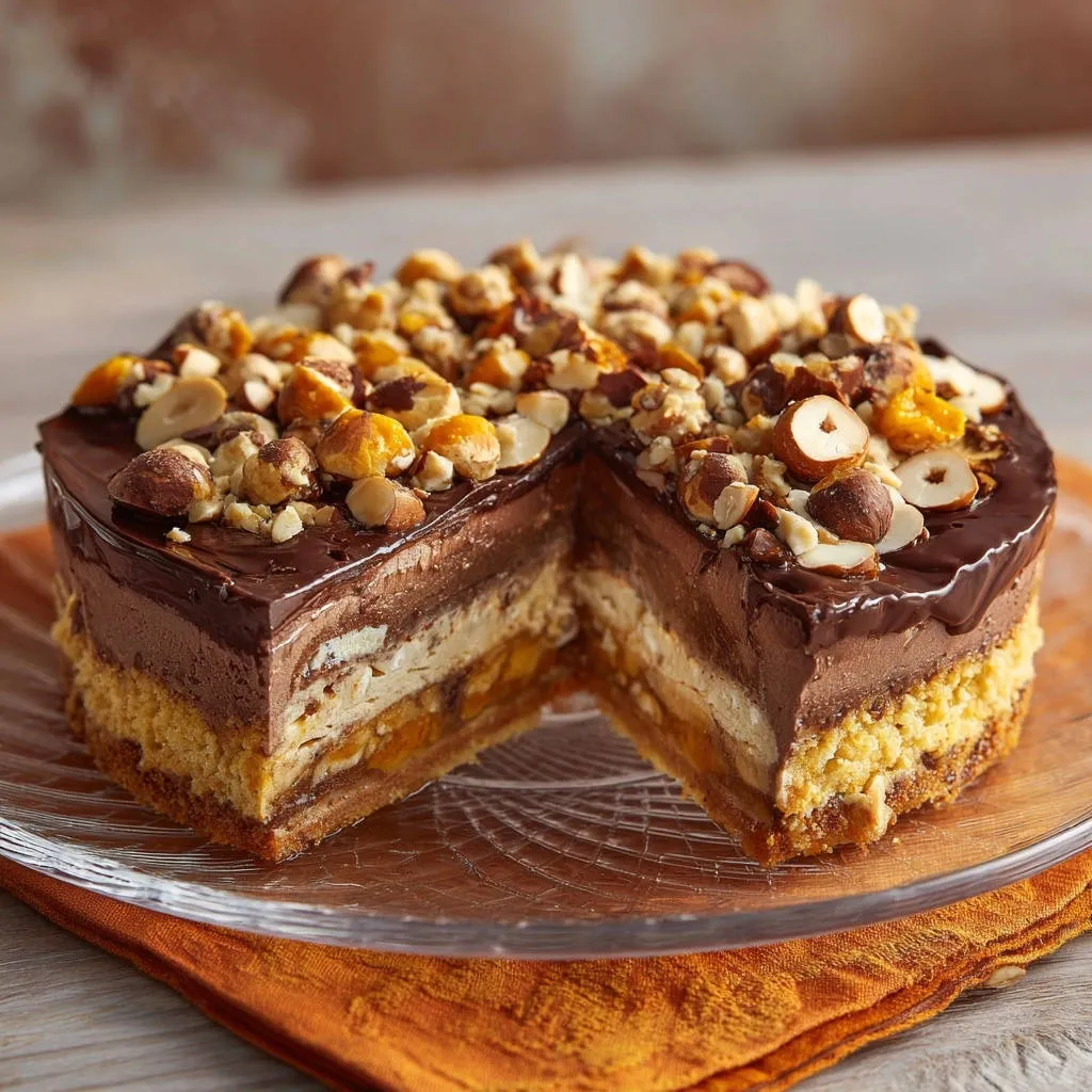 Achieve picture-perfect slices with this Decadent No-Bake Layered Cake, featuring chocolate mousse, vanilla cream, and apricot layers.