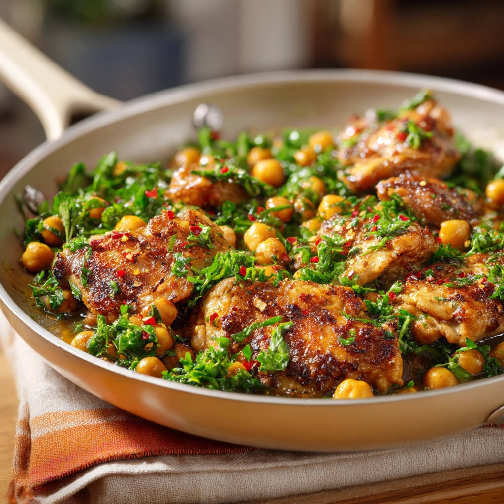 Learn the secret to juicy skillet chicken thighs! This easy one-pan Skillet Chicken, Chickpeas and Greens recipe is packed with flavor & ready fast.
