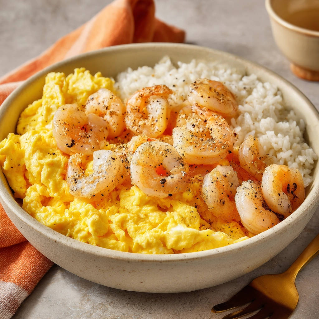 Craving a quick & easy meal? This Shrimp and Scrambled Egg Rice Bowl delivers! Learn the secret to never dry, fluffy scrambled eggs. Ready fast!