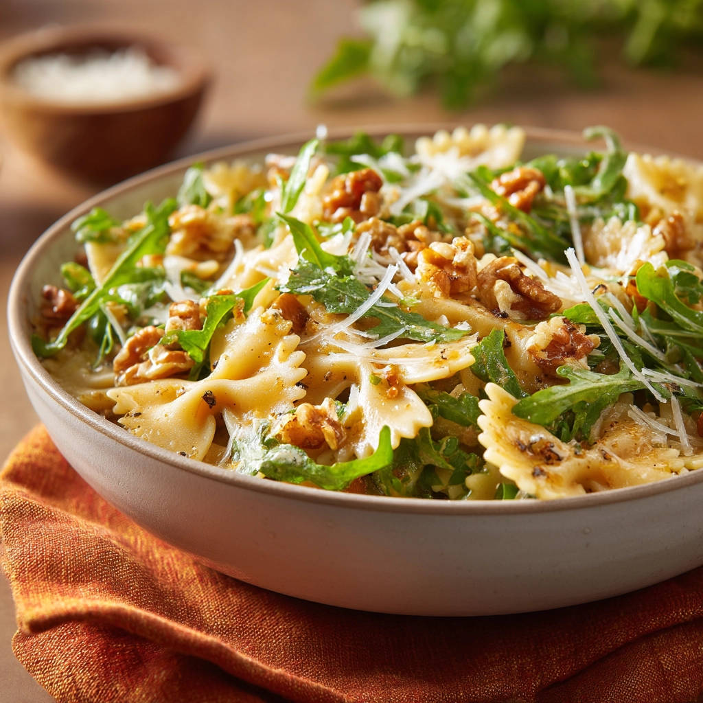 Make perfect Creamy Bow-Tie Pasta with walnuts and arugula – never watery! Learn the simple trick for a luscious, clingy sauce every time.