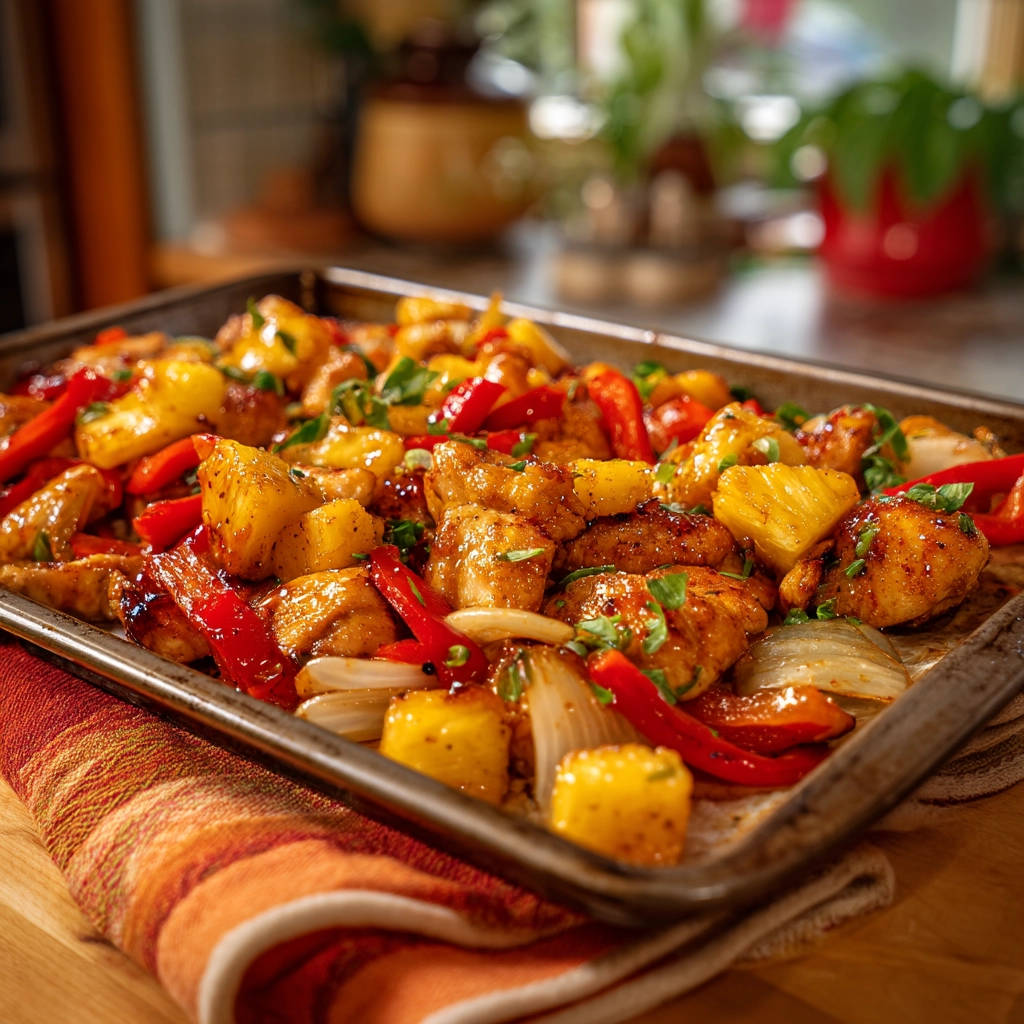Make easy sheet pan chicken and pineapple that’s perfectly juicy every time! Simple ingredients & minimal cleanup for a tasty weeknight dinner.