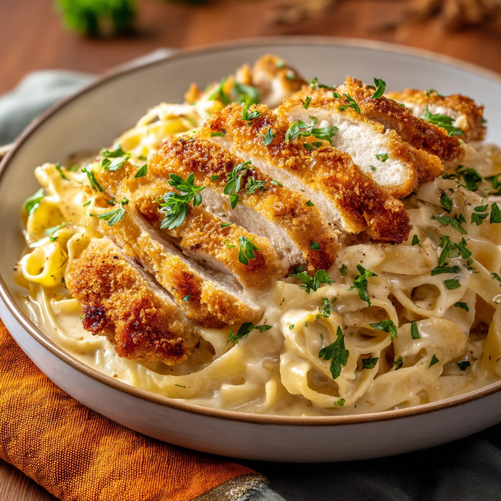 Enjoy creamy fettuccine alfredo with crispy chicken cutlets! This easy recipe ends bland chicken forever. A perfect weeknight comfort food!