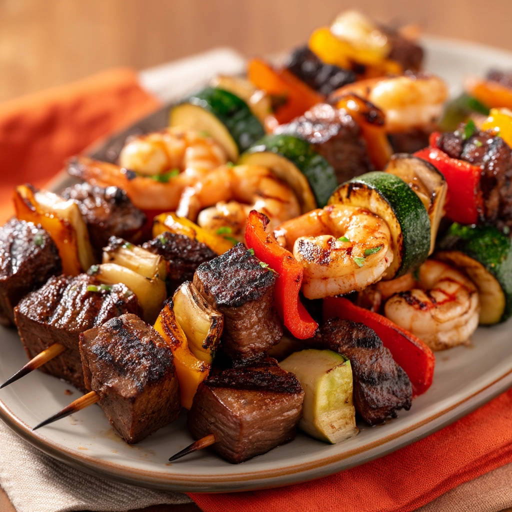 Juicy Grilled Surf & Turf Skewers – No more dry meat! Easy recipe with tender steak & perfectly cooked shrimp. Impress your guests tonight!
