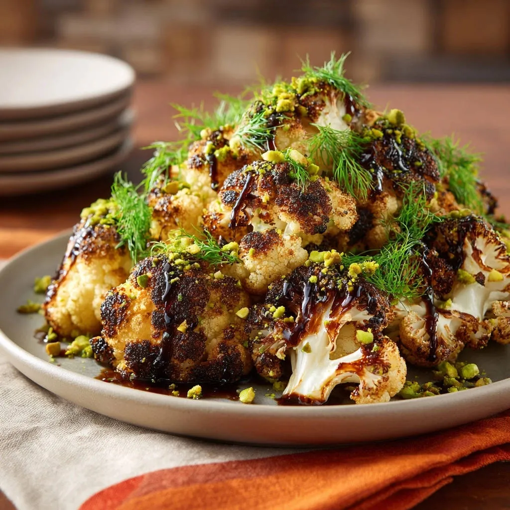 Perfectly caramelized roasted cauliflower with pistachios & dill. Crisp on the outside, tender inside. A game-changer side dish!