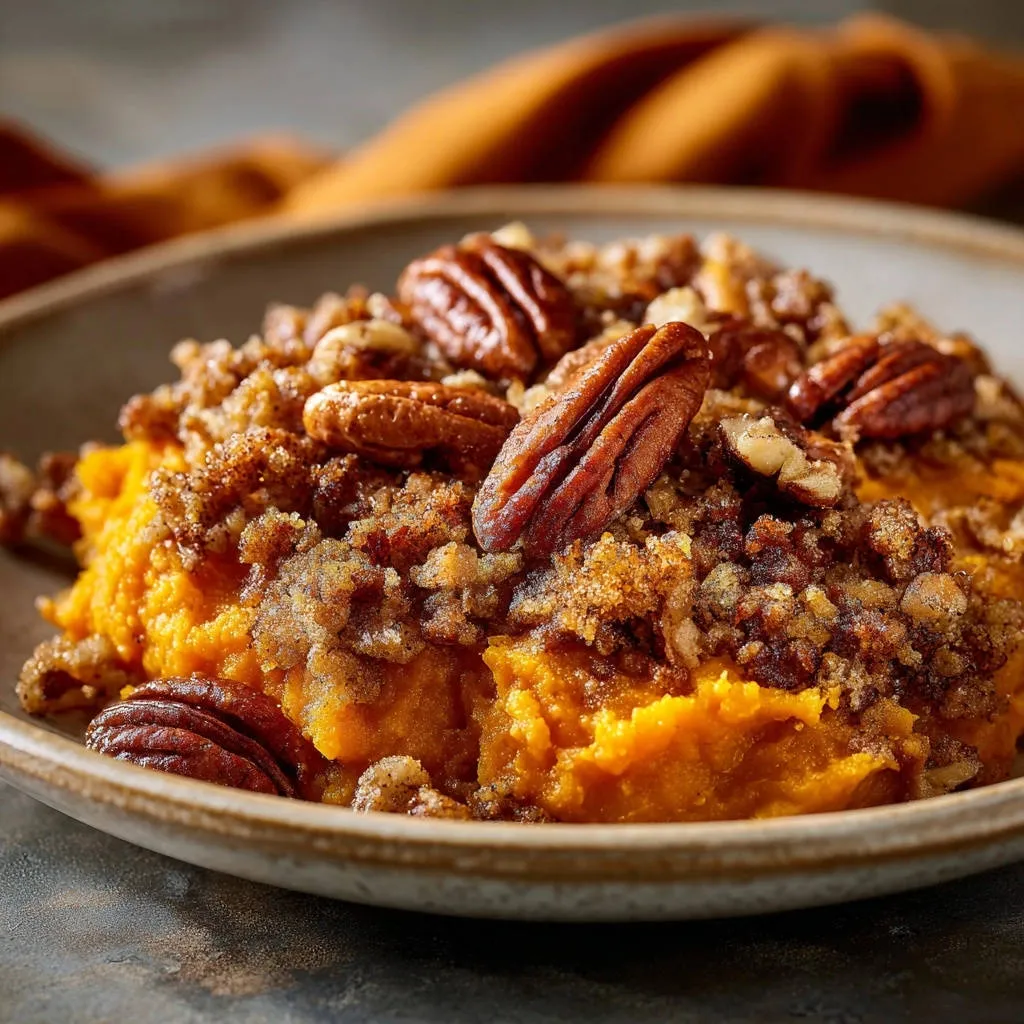 Get the secret to a perfectly crispy Sweet Potato Pecan Crumble! This classic side dish features a delightful crunchy topping.