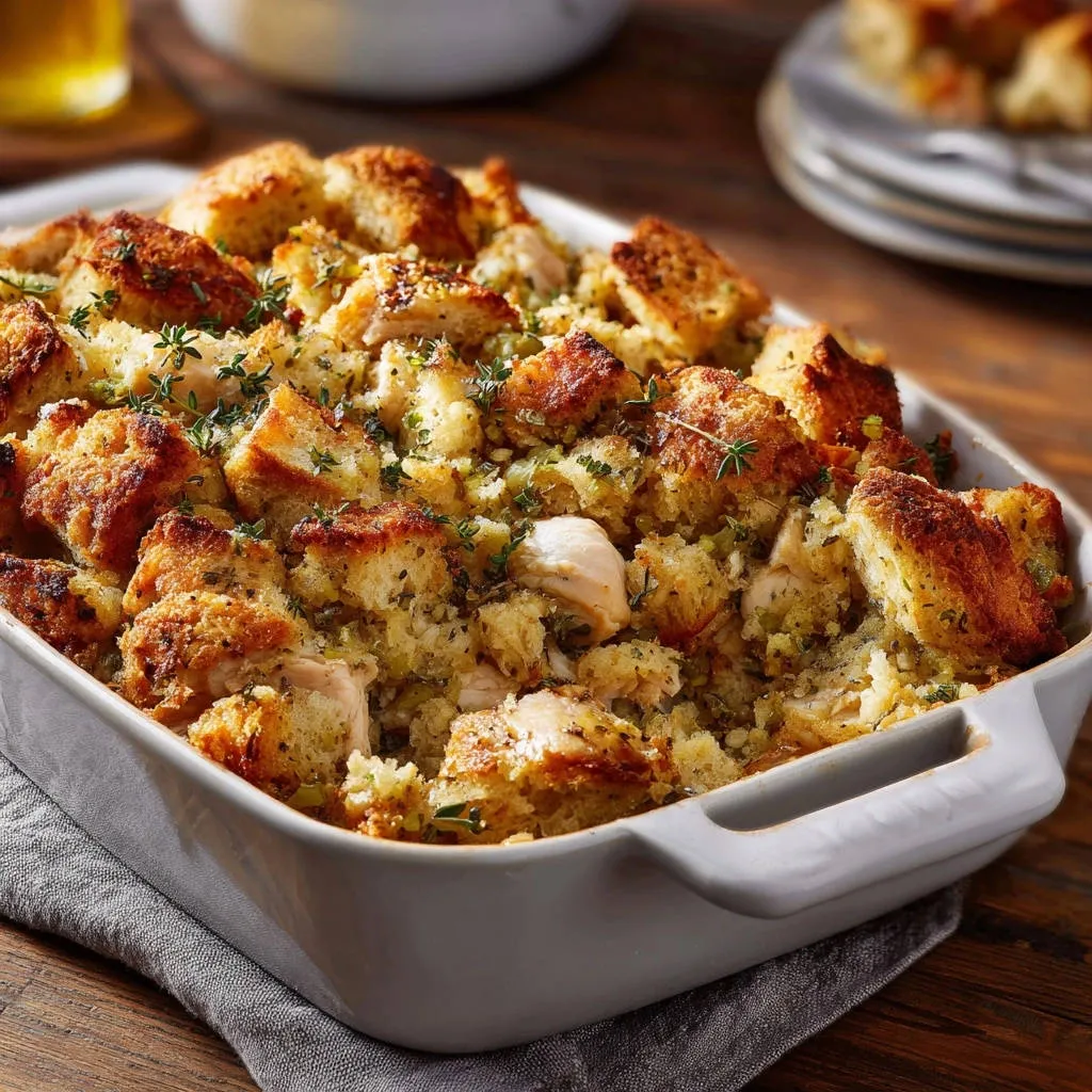 Classic Chicken and Herb Dressing that’s never dry or soggy. Guarantees a moist interior & crispy, golden topping every time.
