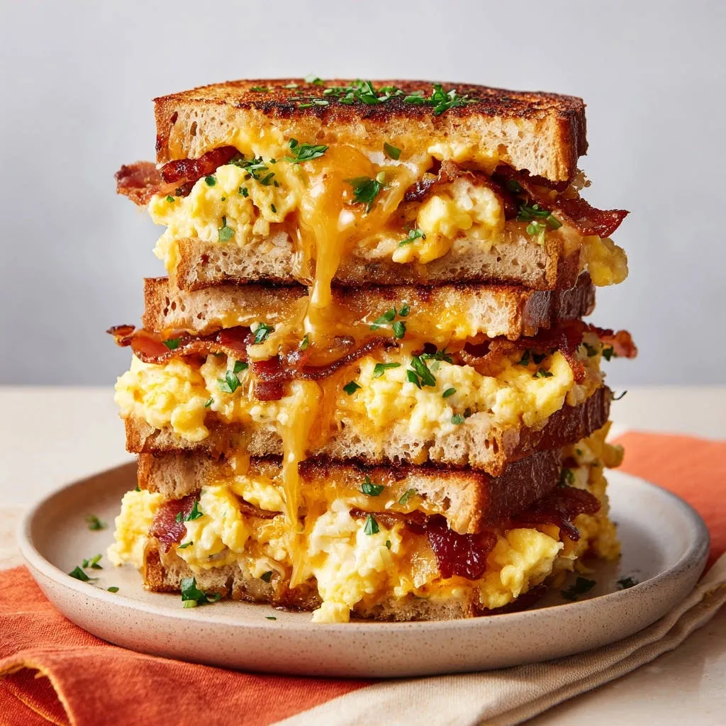 The layering technique itself creates a substantial and visually appealing stack. Each bite delivers a perfect combination of toasted bread, savory bacon, rich cheese, and those signature fluffy eggs.