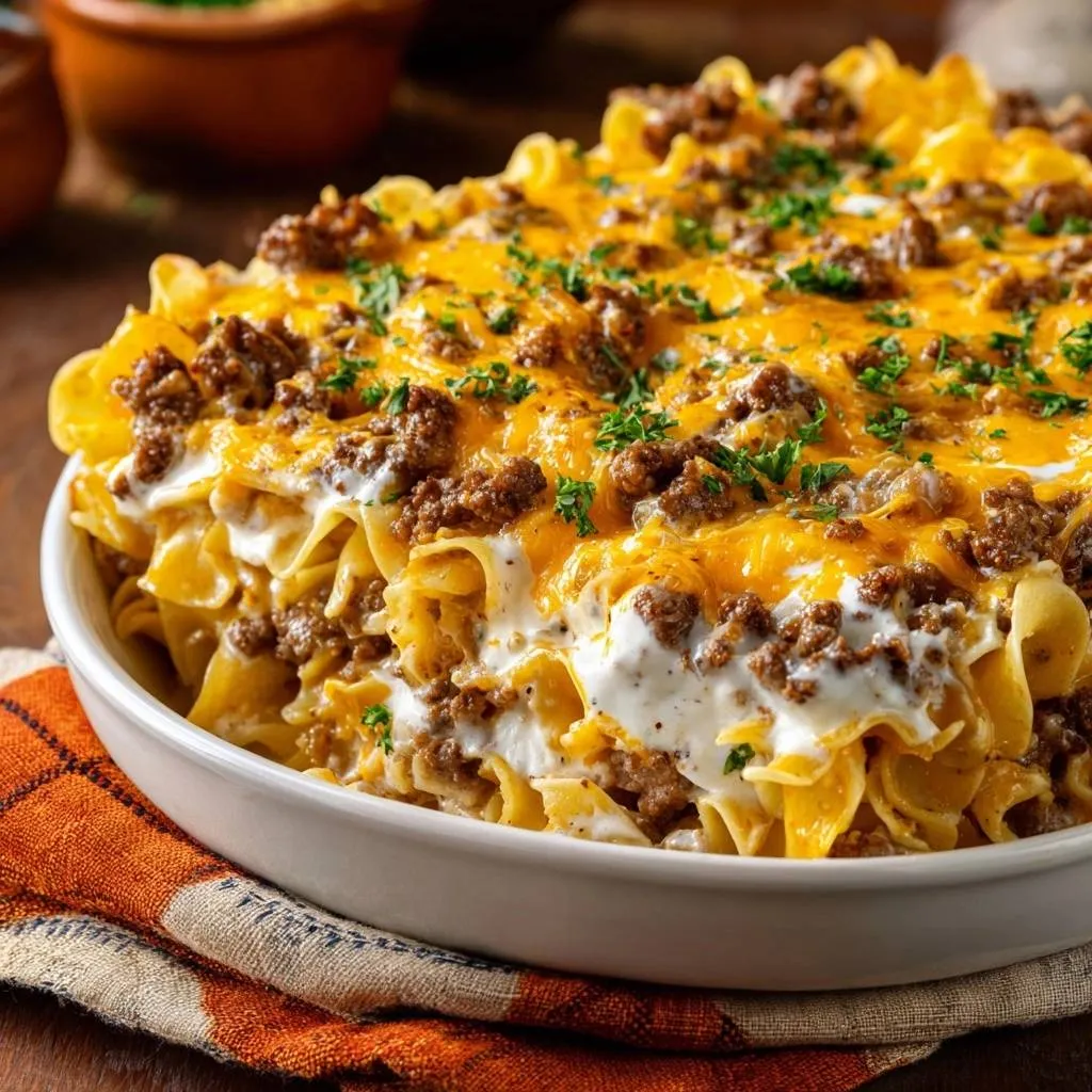 Start with 12 ounces wide egg noodles; they hold structure better than thin ones during baking. Next, 1 1/2 pounds ground beef brings savory depth. Four cups shredded cheddar cheese, divided, delivers that essential melt and browning.