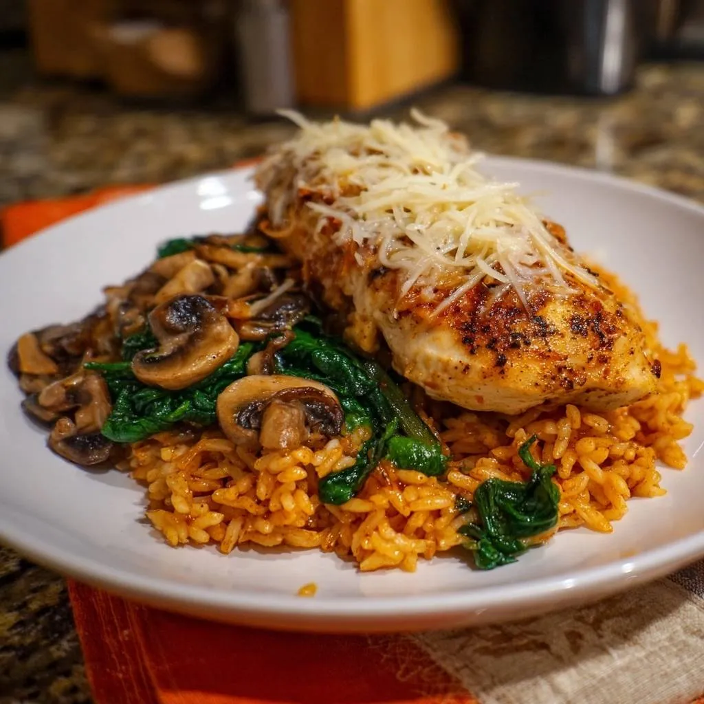 - Return chicken to rice skillet, nestle in. Top chicken with mushroom-spinach mix and cheese. Cover, reduce heat to low, cook 3 minutes until cheese melts and chicken reaches 165F internal without drying. Juiciness guaranteed from the even sear. Serve hot.